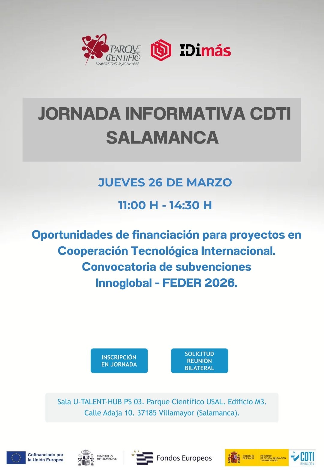 El próximo 26 de marzo tendrá lugar en el Parque Científico de la Universidad de Salamanca una Jornada Informativa del CDTI centrada en las oportunidades de financiación para proyectos en Cooperación Tecnológica Internacional.