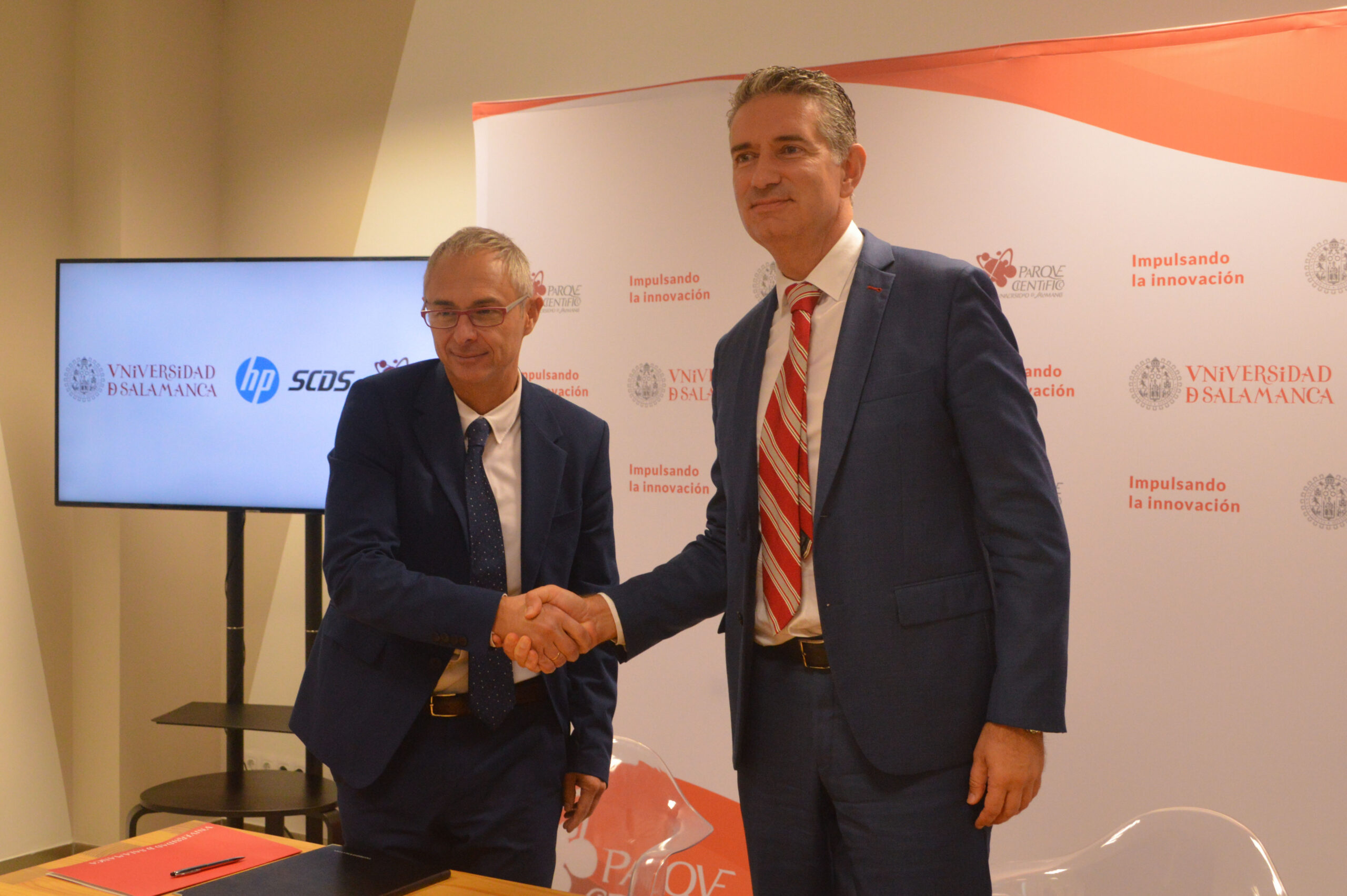 Miguel Ángel Turrado, como director general de HP SCDS, y Ricardo Rivero en calidad de presidente del Parque Científico de la USAL, han sido los encargados de rubricar el acuerdo en un evento público al que han asistieron los alcaldes de Salamanca y Villamayor de la Armuña, Carlos García Carbayo y Ángel Luis Peralvo; el presidente de la Diputación Provincial, Francisco Javier Iglesias, y representantes de la USAL y de la empresa.